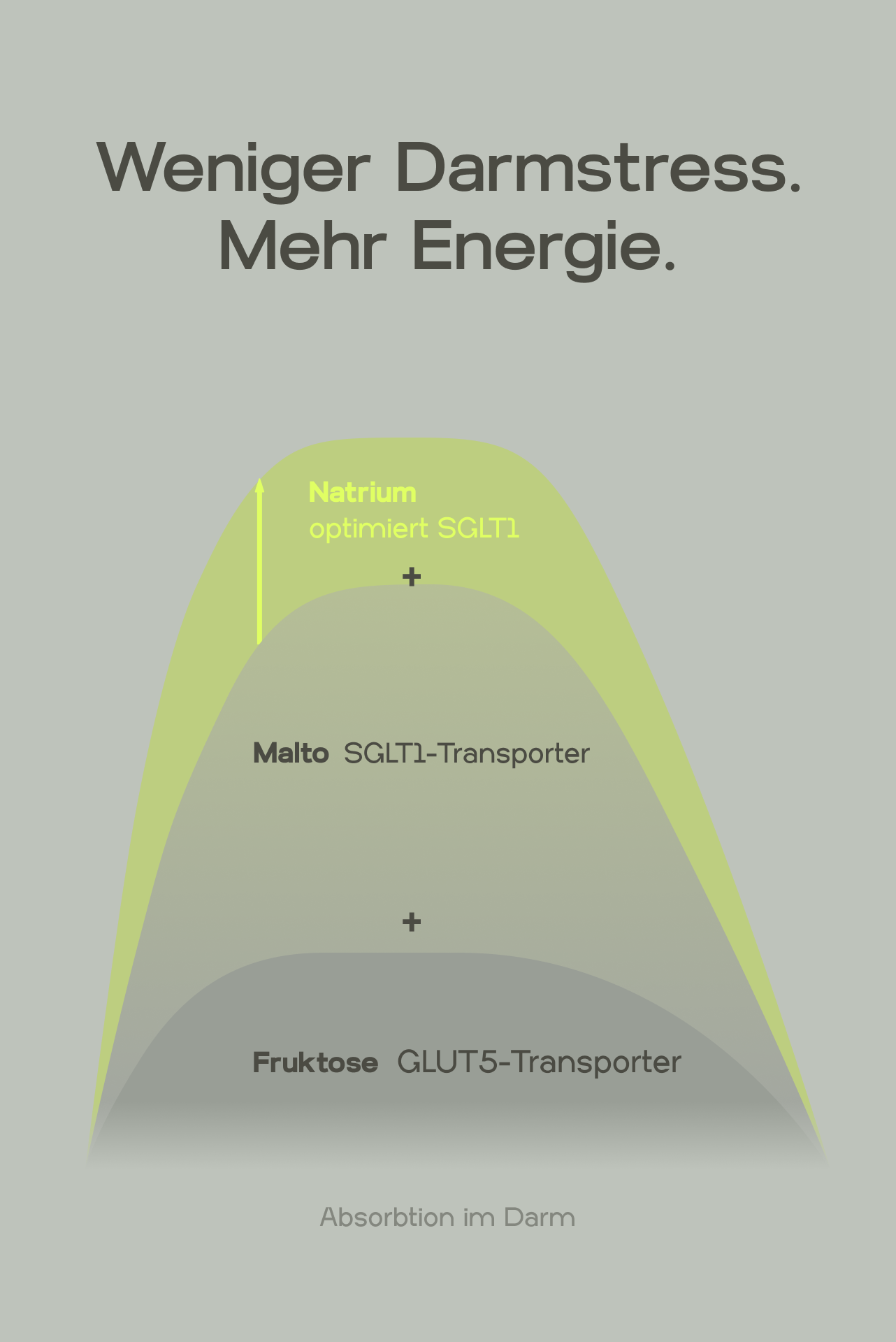 In Kombination mit unserem 2:1-Malto:Fruktose-Mix, der zusätzlich GLUT5 nutzt, sorgt das für eine schnelle Aufnahme und vermeidet, dass Kohlenhydrate im Darm liegen bleiben – die häufigste Ursache für Unwohlsein oder Durchfall bei hoher Carb-Zufuhr.