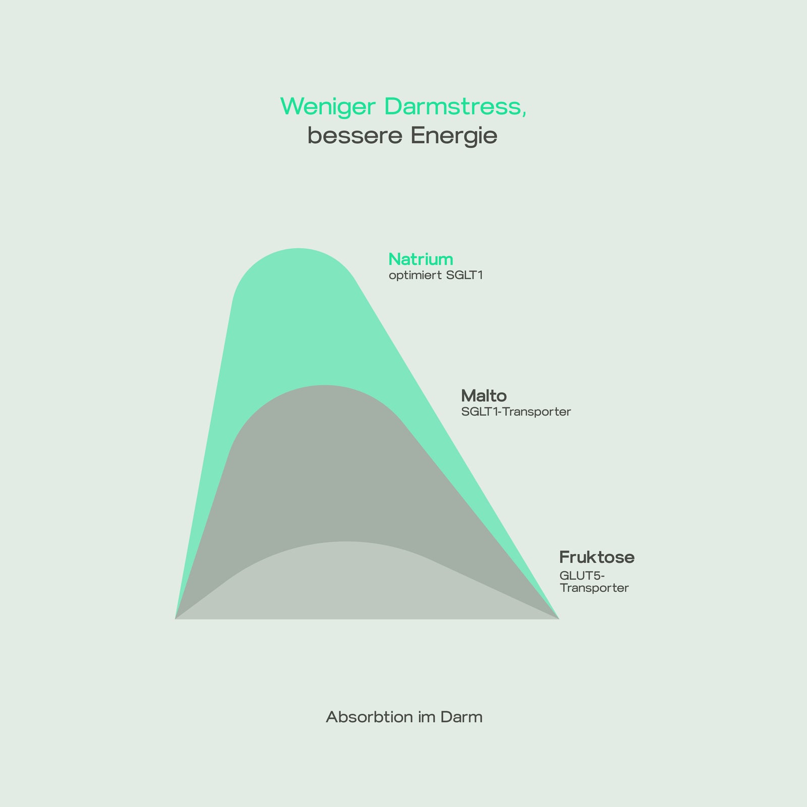 In Kombination mit unserem 2:1-Malto:Fruktose-Mix, der zusätzlich GLUT5 nutzt, sorgt das für eine schnelle Aufnahme und vermeidet, dass Kohlenhydrate im Darm liegen bleiben – die häufigste Ursache für Unwohlsein oder Durchfall bei hoher Carb-Zufuhr.