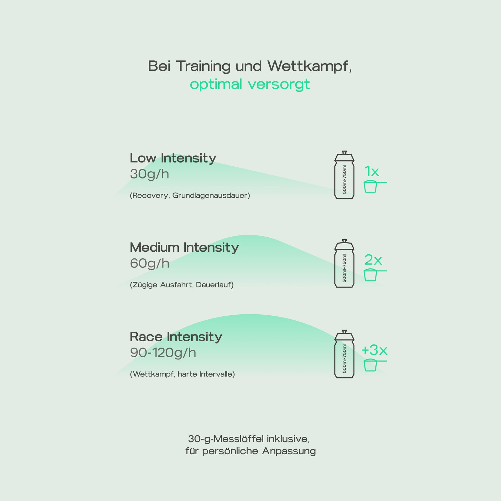 Mit 2:1 bekommst du die gleiche Leistung – bei mehr Magenkomfort und weniger Risiko. Und: Du bist flexibler, egal ob du 60 g/h fährst oder 120.